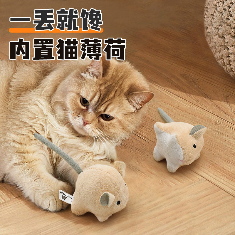 柔らかい手触りが特徴のネズミ型猫用おもちゃで、猫が手で抱きしめたり蹴ったりして遊べます。