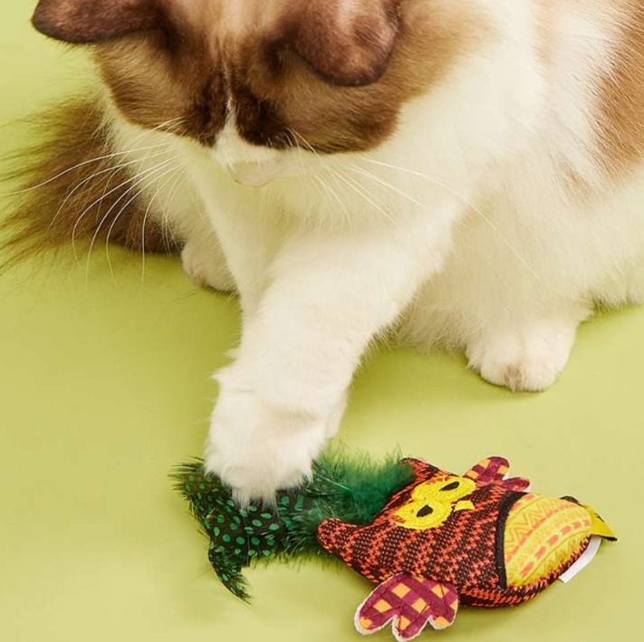 カラフルな小鳥のデザインに天然羽根を組み合わせ、猫の狩猟本能を強く刺激します。