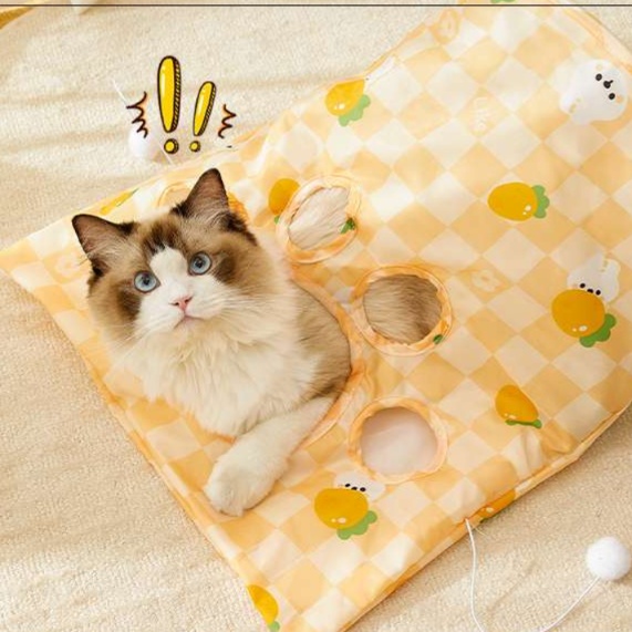 チェック柄のマットに穴が開いた新感覚のトンネル型猫じゃらしおもちゃです。