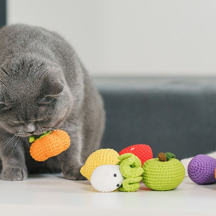 愛猫の好奇心を刺激する可愛らしい野菜と果物モチーフの猫 おもちゃセットです。 かぼちゃ、なす、いちご、りんご、レモンなど多彩な形状で飽きずに遊べる運動不足解消グッズとして最適です。 柔らかな編み素材で作られており、転がしたり咥えたりして狩猟本能を満たしながら楽しく運動できます。 室内飼いの猫ちゃんの日々の遊び相手にぴったりな商品です。