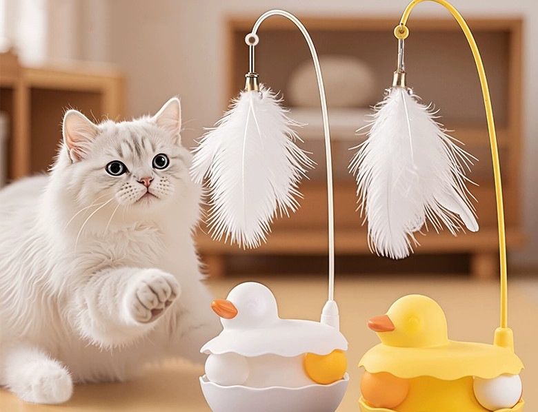 土台を揺らすとふわふわの羽根が揺れて猫ちゃんの狩猟本能を刺激します。