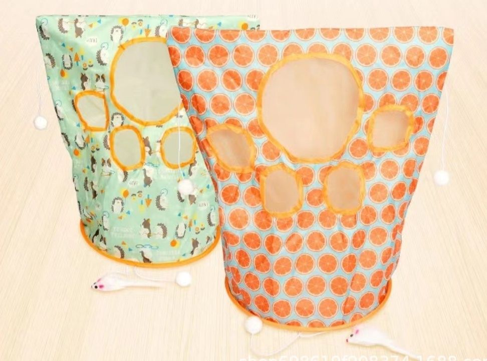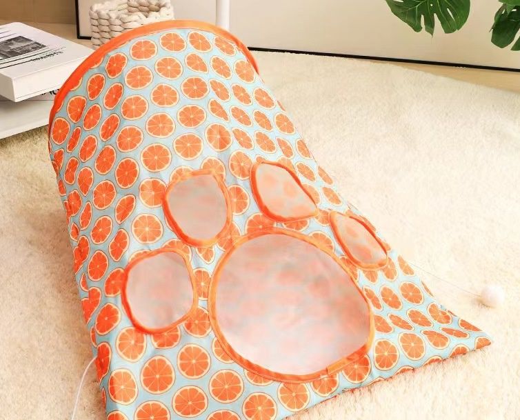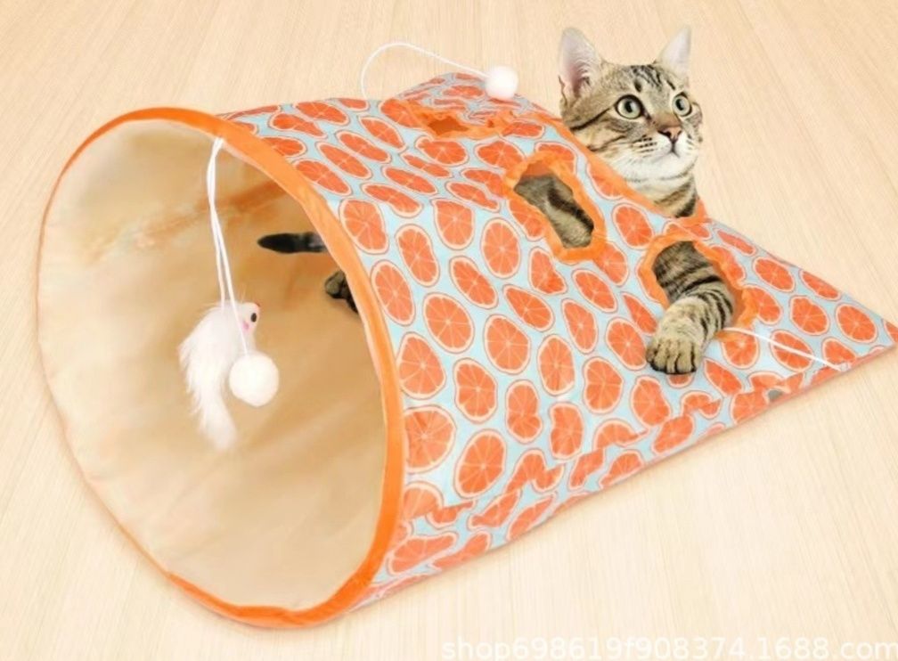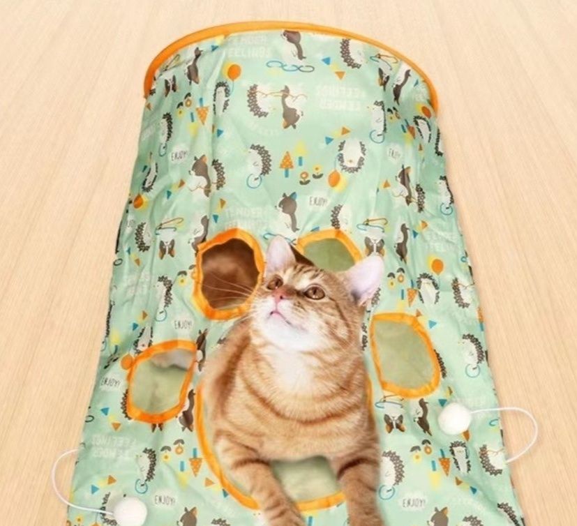 トンネル型の遊び場に複数の穴が開いており、猫ちゃんが出入りして遊べる設計になっています。
