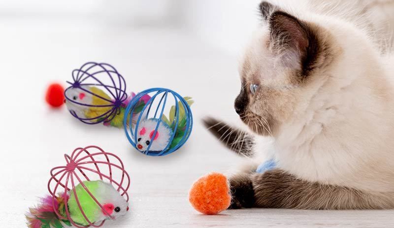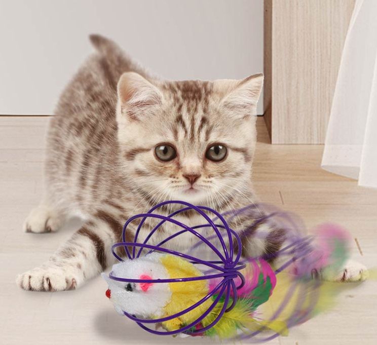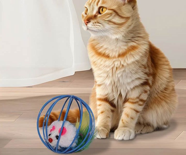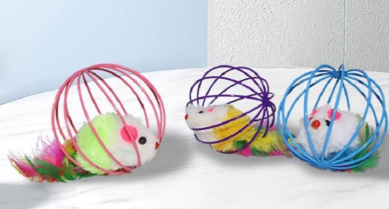 かご型ボールの中に羽根付きねずみが入った猫 おもちゃです。