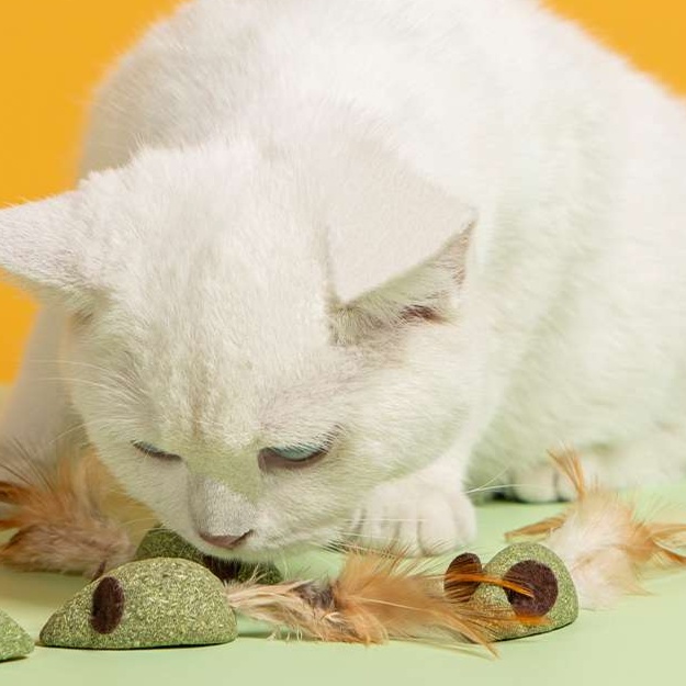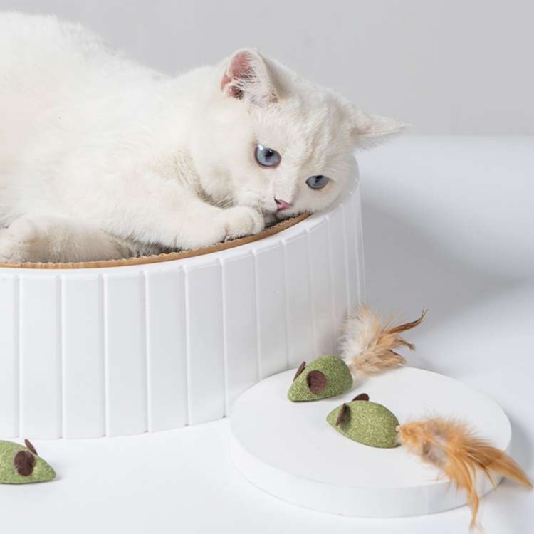 ふわふわの羽が付いた緑色のネズミ型デザインで、猫の好奇心を引き出します。