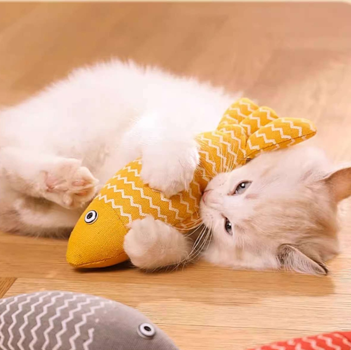 柔らかな生地で作られた魚型の猫じゃらしは、波模様のデザインが特徴です。猫ちゃんの好奇心を刺激し、楽しく遊べるおもちゃとなっています。ストレス発散や運動不足解消にぴったりで、飼い主と猫の絆を深める時間を提供します。活発に遊ぶことで健康をサポートし、日々の生活に楽しさをプラスします。
