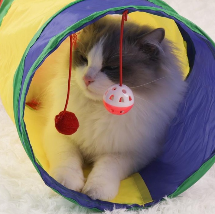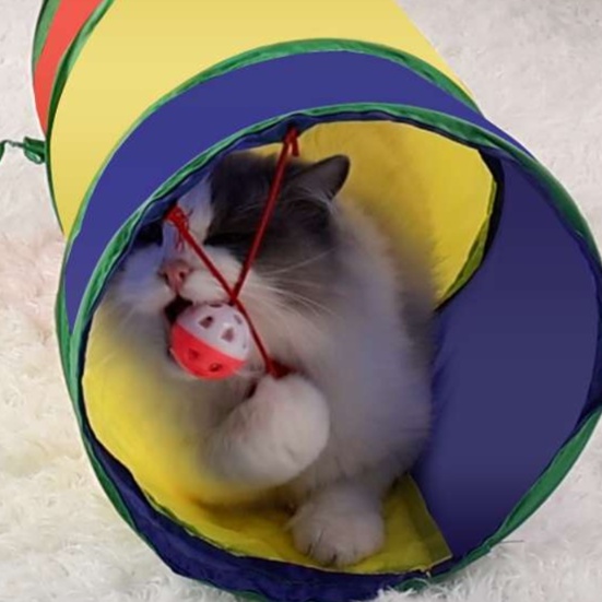 柔らかい素材で安全に遊べ、トンネル内で猫が自由に動き回れます。