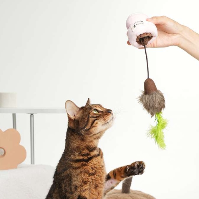 猫の興味を引く羽根付きの揺れる仕掛けで夢中になって遊べる工夫