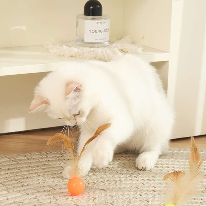 軽量で弾力性に優れた小さなボールに、カラフルな羽根が付いた猫じゃらし。猫の好奇心を引き立て、遊び心を刺激します。動きに合わせて羽根が揺れ、猫の狩猟本能を満たすこと間違いなし。日々の遊びにぴったりなアイテムです。愛猫との楽しいひとときを演出する、必須のおもちゃです。