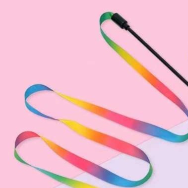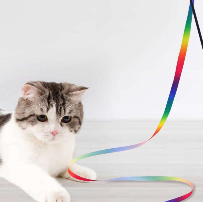 グラデーションが美しい虹色リボンで、猫の興味を引く視覚的な魅力を演出