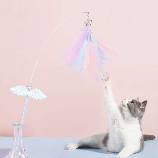 柔らかな羽根素材を使用した猫じゃらし。天使の羽モチーフが施されたデザインが魅力的で、猫の興味を引きつけます。伸縮性のある釣り竿タイプで、飼い主との遊びも楽しめるおもちゃ。愛猫の運動不足解消やストレス発散にぴったりです。遊び心をくすぐるこの猫じゃらしで、楽しいひとときをお過ごしください。